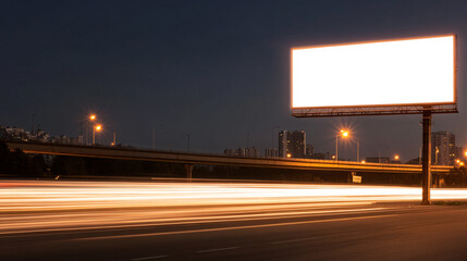 An empty illuminated billboard captures attention above a bustling highway at night. The soft glow of the billboard contrasts with the fast-moving light trails of vehicles below. In the background, a