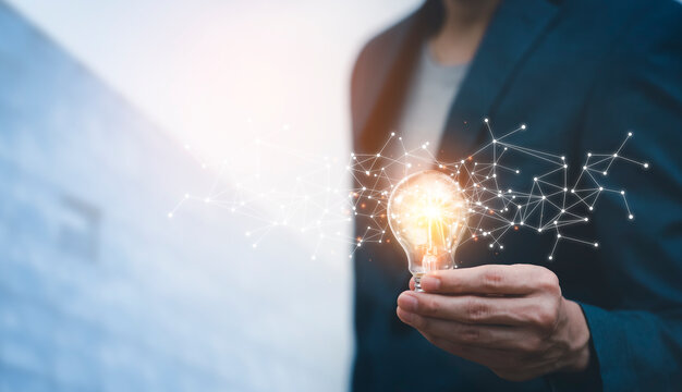 business hand holding illuminated light bulb, idea, innovation and inspiration concept.concept of creativity with bulbs that shine glitter, creativity with bulbs that shine glitter.Inspiration of idea