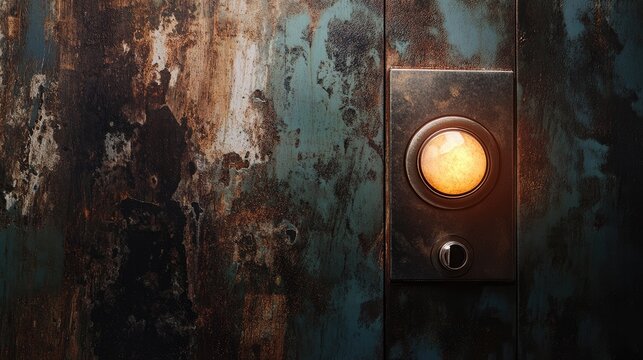 Vintage elevator button on a weathered metal panel showcasing an illuminated round switch against a rustic background.