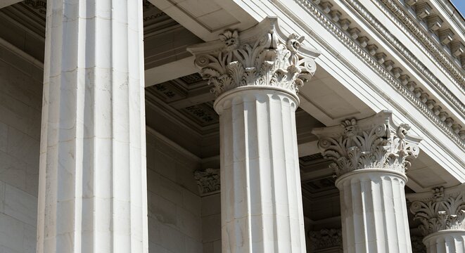 Grand hall with elegant white marble columns and arches, illuminated by bright sunlight creating dramatic shadows