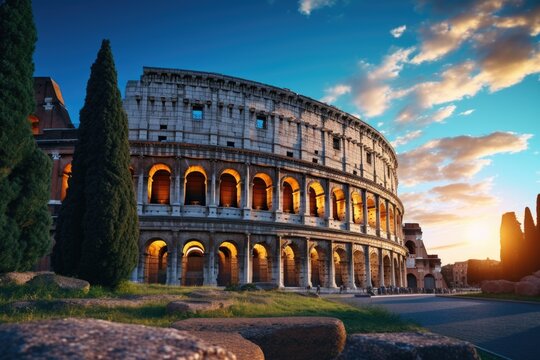 Large building with illuminated arches at sunset. Suitable for architectural concepts