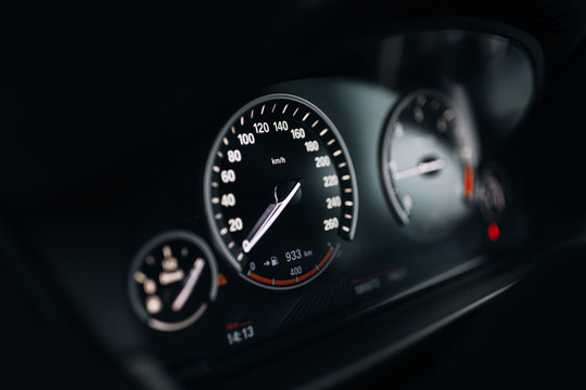 Dashboard car close-up. Car speedometer with illuminated. Screen display of car status warning light on dashboard panel symbols which show the fault indicators