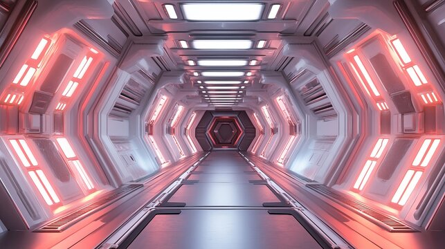 Futuristic corridor with red lighting and hexagonal end point in a spaceship interior design