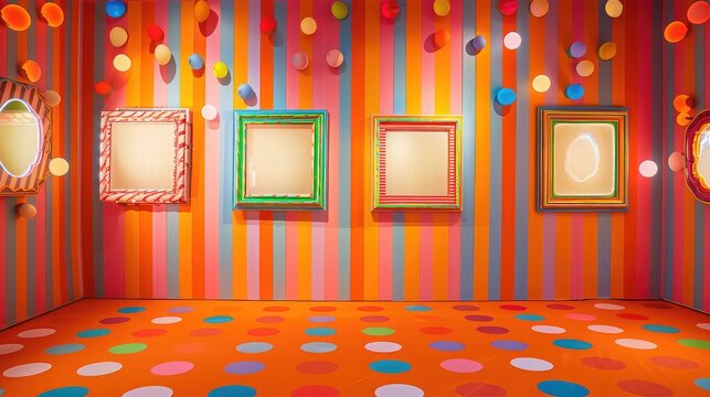 A playful and colorful gallery featuring candy-striped frames on a polka-dotted orange wall, lit by colorful, whimsical lighting fixtures
