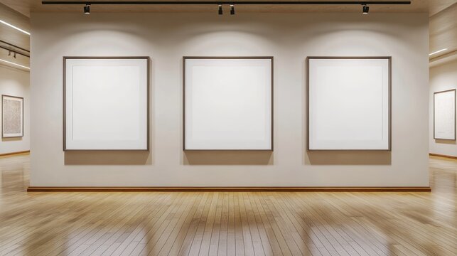 Empty gallery wall with three blank canvases