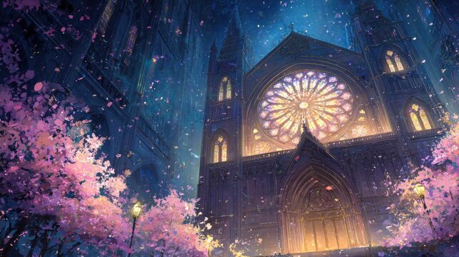 Pink blossoms frame a grand, ornate cathedral against a twilight sky, softly illuminated with warm light