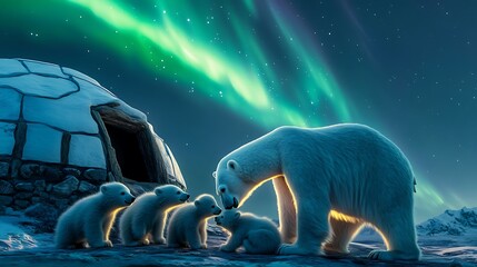 A mother polar bear gently nudging her cubs near an igloo, the family illuminated by the soft glow of the northern lights dancing across the night sky. 32k, full ultra hd, high resolution