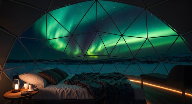 Aurora borealis dome hotel igloo northern lights winter travel arctic vacation luxury escape experience on transparent background