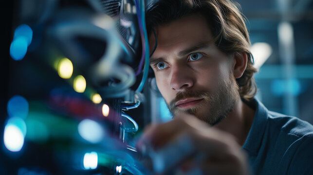Faceless focused network engineer adjusting equipment in server room, surrounded by illuminated indicators and cables, IT infrastructure maintenance, technology facility work, defocused person,