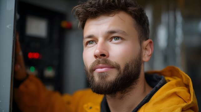 A thoughtful man in a bright yellow jacket observes an industrial control panel with illuminated indicators