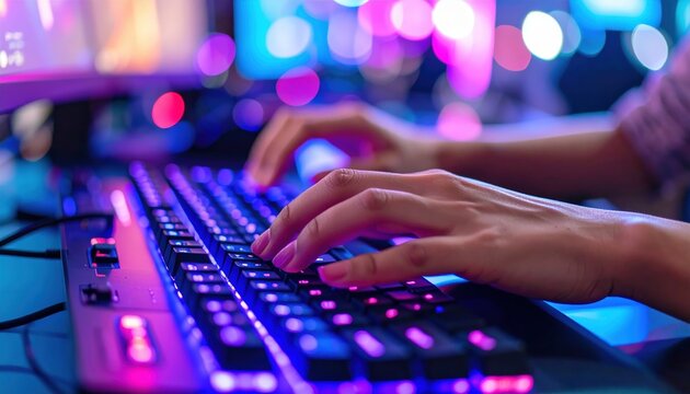 Close-up of hands typing on a laptop, illuminated by natural light, with a blurred screen in the background.