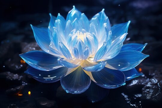 Captivating image of a blue lotus illuminated in the dark, floating on tranquil waters