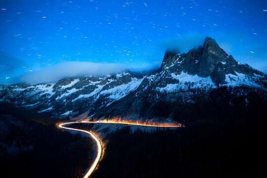 Cars drive Highway 20 at night over Washington Pass, below Liberty Bell and the Early Winter Spires, North Cascades Scenic Highway Corridor, Washington.