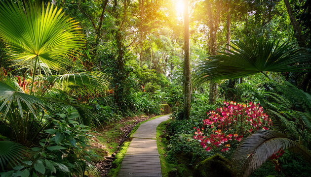 Enchanting leafy path through sunlit forest, garden of eden concept