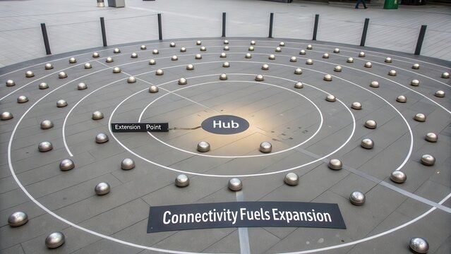 Modern circular urban installation with illuminated nodes and inspirational text about connectivity