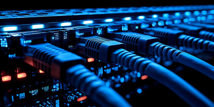 Close-up of blue Ethernet cables plugged into a dark server rack with illuminated indicator lights.