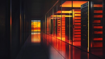 Illuminated data center aisle with glowing server racks