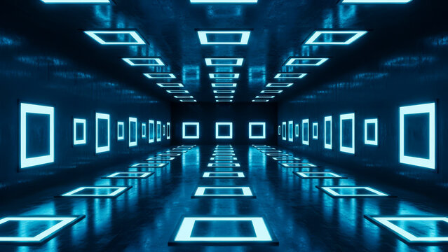 Abstract futuristic tunnel of glowing blue squares and digital data movement toward vanishing point