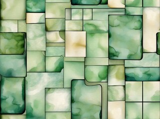 Abstract light pastel green watercolor rectangles and squares painting design background in seamless repeating pattern from Generative AI