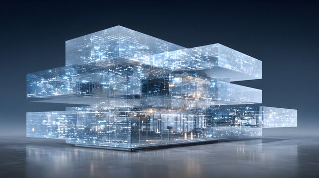 Blue 3D cubes glow with soft red accents, creating a surreal, digital landscape of geometric shapes