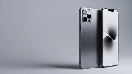 Two modern grey smartphones, one showing its back camera and the other its front screen, against a light grey background.