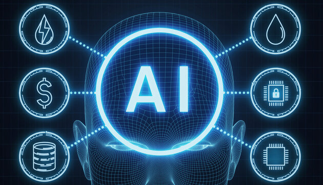 An illustrative depiction of artificial intelligence, with AI text in a glowing blue light in the center and brain symbol and other icons around it.
