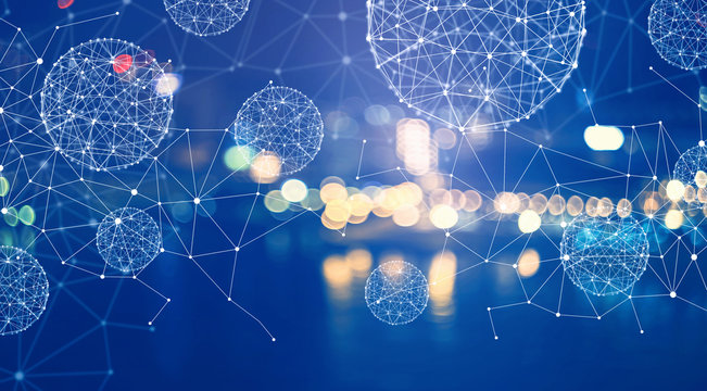 Futuristic city skyline with glowing digital lines in a blue background.