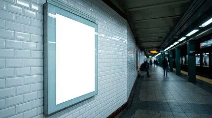 Blank illuminated billboard mockup in a bustling subway station with copy space for advertising or urban information display.