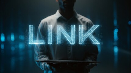A male figure in a white shirt holds a dark tray in a futuristic setting, illuminated by blue tones and glowing digital text reading 'LINK'.