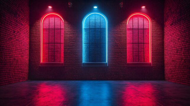Sunlight streams through large arched windows in a dark industrial space, illuminating the floor