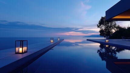 A serene evening scene featuring solar lanterns illuminating a modern patio by a pool. The warm bokeh creates a cozy atmosphere for outdoor gatherings.