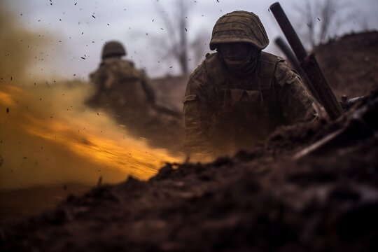 A group of soldiers stand close to a powerful explosion in the background, illustrating the intensity and danger of war.