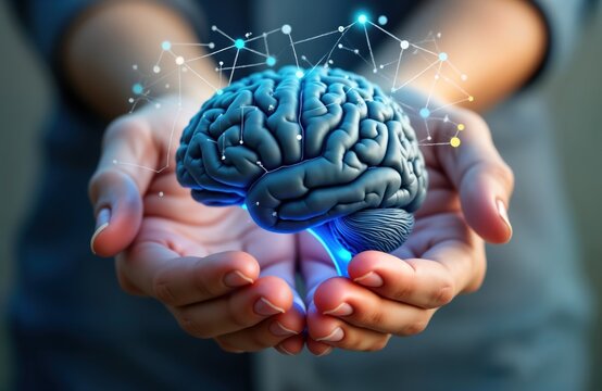 Human hands gently hold 3d model of brain. Tech, info intelligence concept. Brain presented as complex digital object with glowing neural network connections. Futuristic view of mind, information.