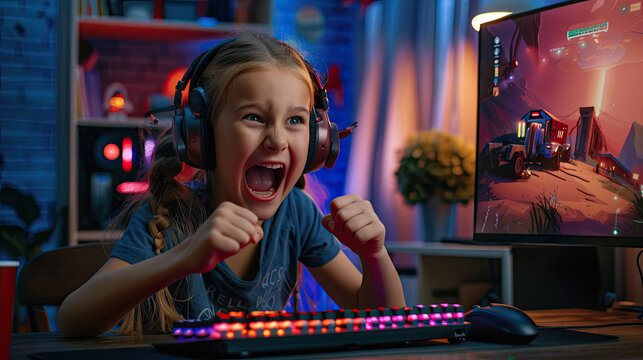 Image of excited girl playing video game on pc