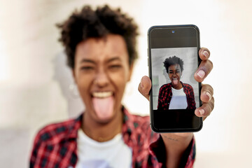 Cheerful young woman with tongue out showing her photograph on smart phone