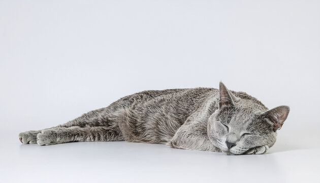 A Russian Blue lying down and sleeping. The background is plain white, eyes closed. 502900
