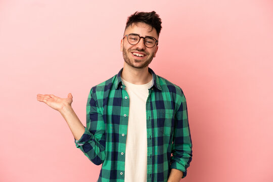 beauty, make up and people concept - happy smiling young woman holding something imaginary on palms over grey background