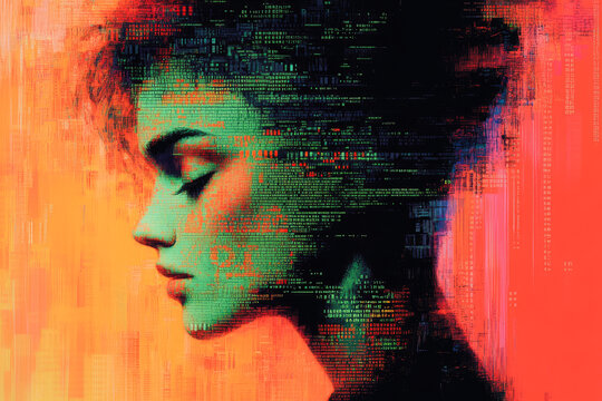 A side profile of a woman's face intricately melded with digital code and vibrant colors, representing technology's fusion.