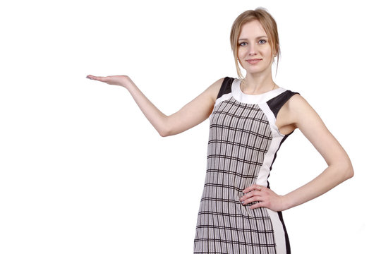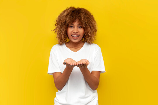 young curly american girl with braces holds empty palms in front of her on yellow isolated background