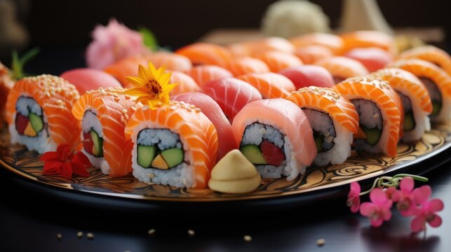 A plate of sushi rolls with a flower on top. Imaginary food photo.