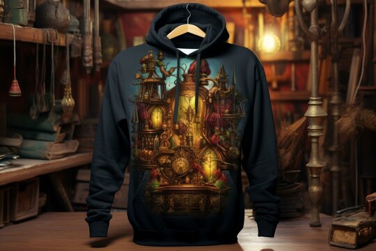 Stunning graphic hoodie featuring a fantasy steampunk design displayed in a vintage shop setting