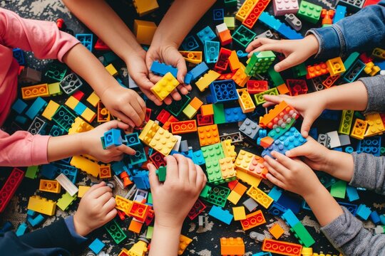A chameleon wearing a hard hat and vest constructs a wall with brightly colored blocks at a lively construction site under bright lighting. Generative AI