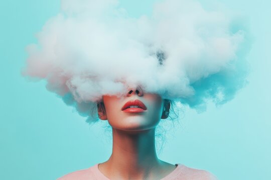 Surreal portrait of a woman with clouds obscuring her face against a teal background.