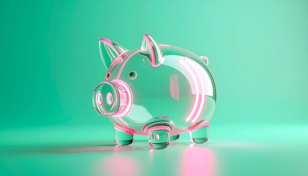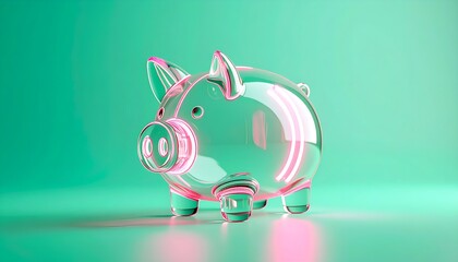 A surreal transparent glass piggy bank with neon lights stands on a green background, creating a surreal atmosphere.