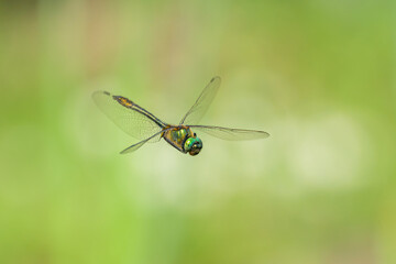 A Downy Emerald dragonfly flying over water