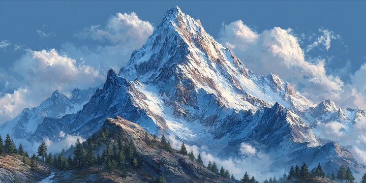 Majestic Snow-Covered Mountain Peaks Under a Clear Blue Sky with Lush Pine Forest Below