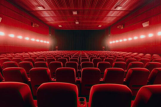 Rows of red and blue empty seats await the audience in a dark movie theater, ready for a film screening