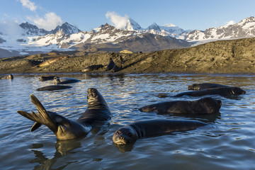 Southern elephant seal pups (Mirounga leonina), in melt water pond, St. Andrews Bay, South Georgia