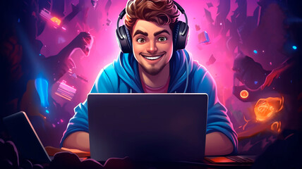 Gamer in the process of playing games, happy and satisfied face, advertising banner of computer game clubs. Generative AI