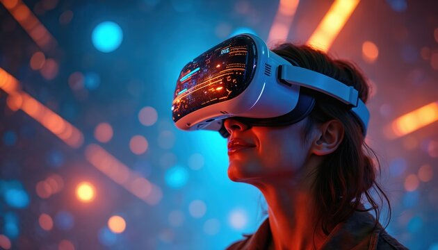 Woman explores virtual reality with vibrant effects, immersive experience. VR headset, digital world. Futuristic tech innovation, light effects, abstract design, colorful neon graphic cyberspace,